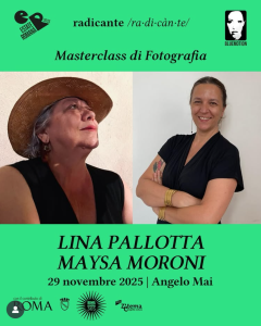 MASTERCLASS DI FOTOGRAFIA di MAYSA MORONI e LINA PALLOTTA iscriviti qui Nell'ambito di Radicante, Scuola Transmediale Transfemminista - Sezione Arti Visive - percorso formativo 2025/2026. Radicante è una scuola separatista: tutte le attività sono rivolte SOLO a donne, persone trans e non binarie. La masterclass è gratuita, tessera Arci obbligatoria* Le iscrizioni terminano il 25 novembre 29 novembre 2025 | 10.00 - 13.00 MASTERCLASS DI MAYSA MORONI Maysa Moroni è photo editor per il settimanale Internazionale dal 2008, in particolare…